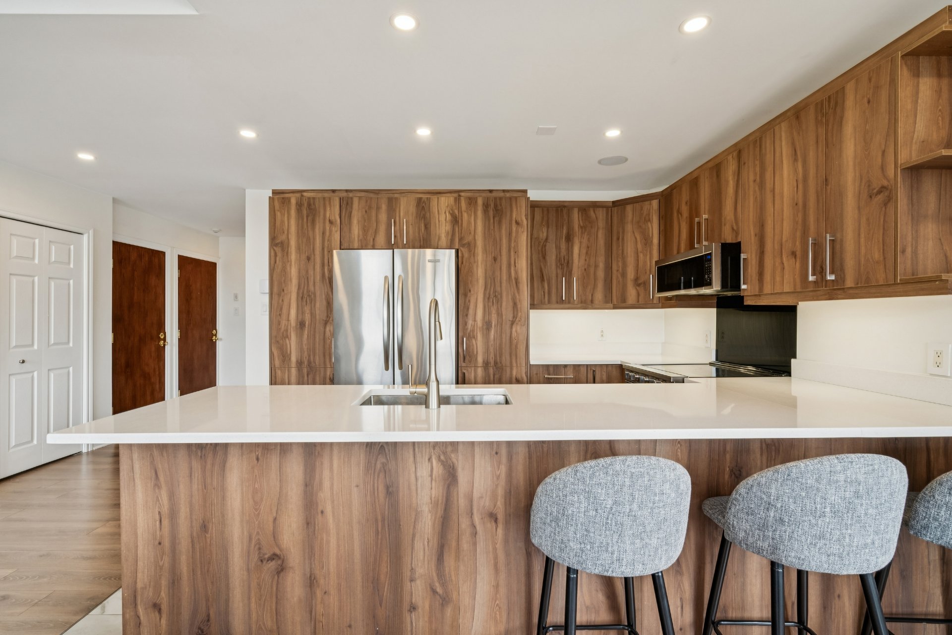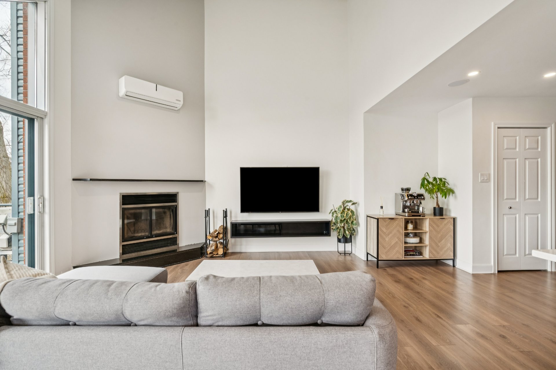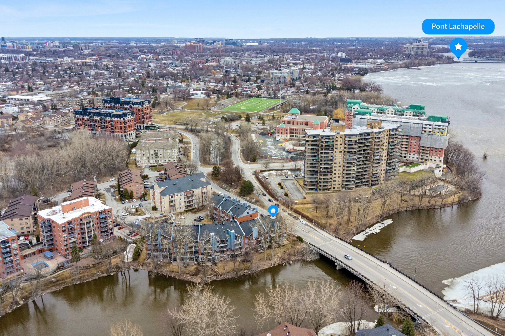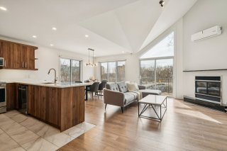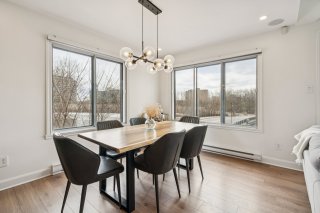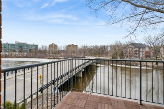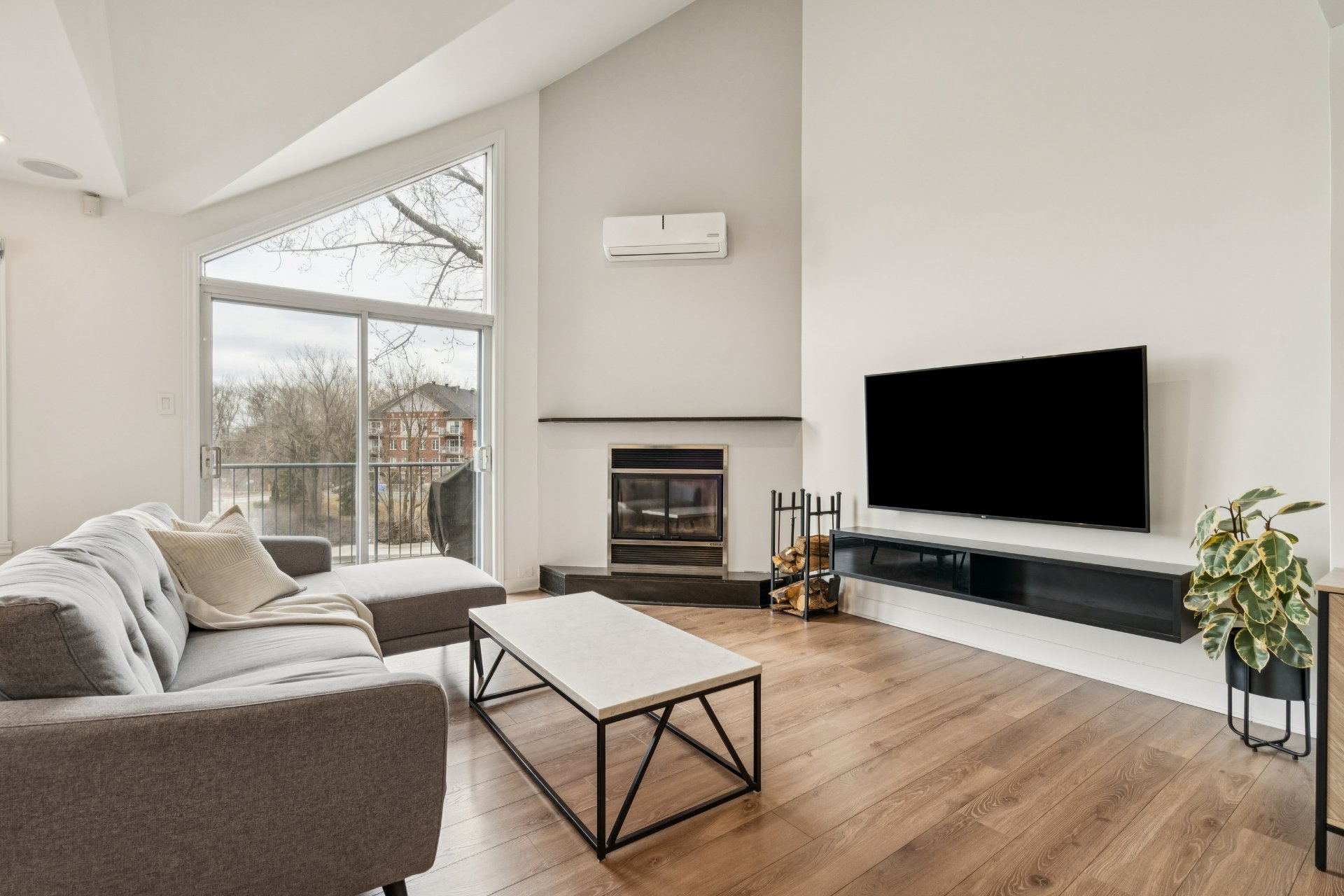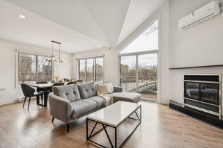 Unité de coin au dernier étage offrant une luminosité exceptionnelle grâce à sa fenestration abondante. Plafond cathédrale au salon atteignant ±16 pieds, créant un espace de vie ouvert et impressionnant. Entièrement rénovée avec des matériaux de qualité. Cuisine sur mesure avec îlot en quartz, salle de bain modernisée et foyer au bois conforme. Deux stationnements intérieurs, une rareté. Située à proximité de tous les services, dans un environnement paisible près de l'eau. Véritable clé en main.